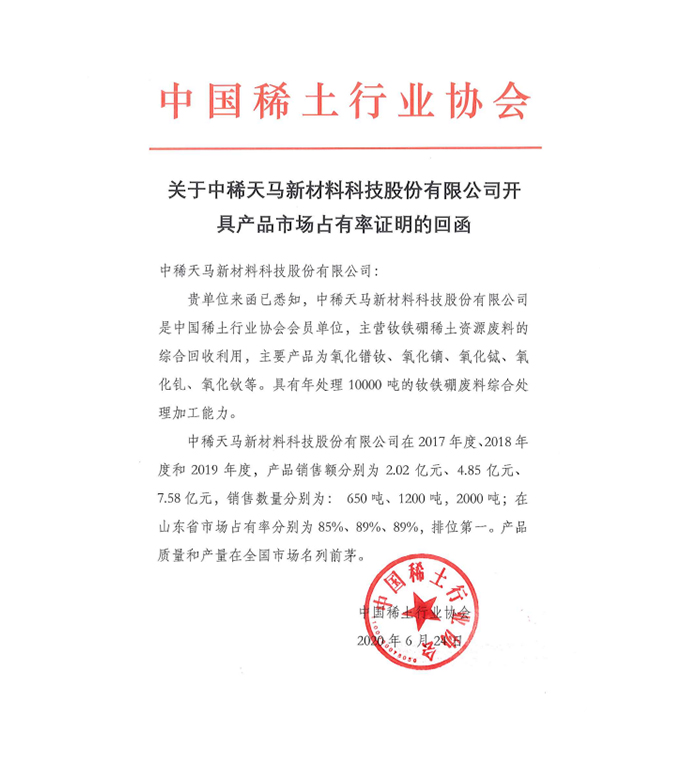 中稀天馬是全國(guó)綠色發(fā)展聯(lián)盟聯(lián)合發(fā)起單位,山東省稀土協(xié)會(huì)、山東環(huán)境科學(xué)學(xué)會(huì)高級(jí)會(huì)員單位,國(guó)家級(jí)高新技術(shù)企業(yè)。憑借優(yōu)良的品質(zhì)和高效的服務(wù)贏得業(yè)內(nèi)及市場(chǎng)的一致好評(píng)。