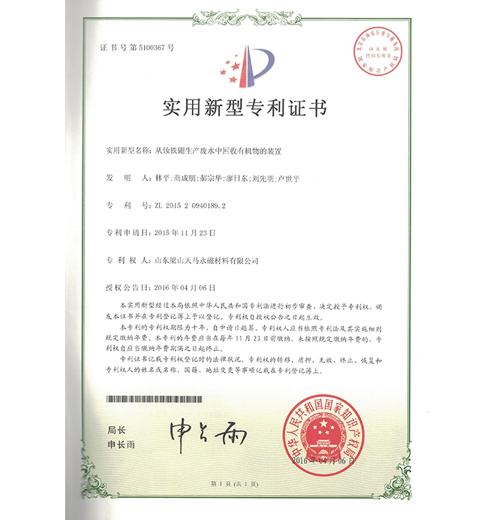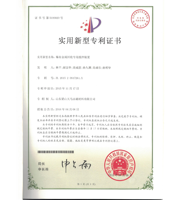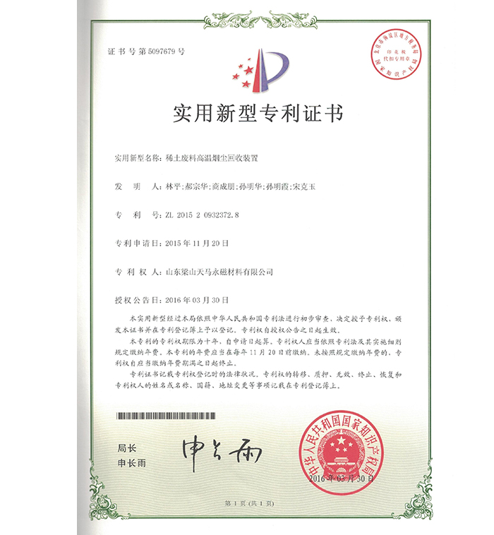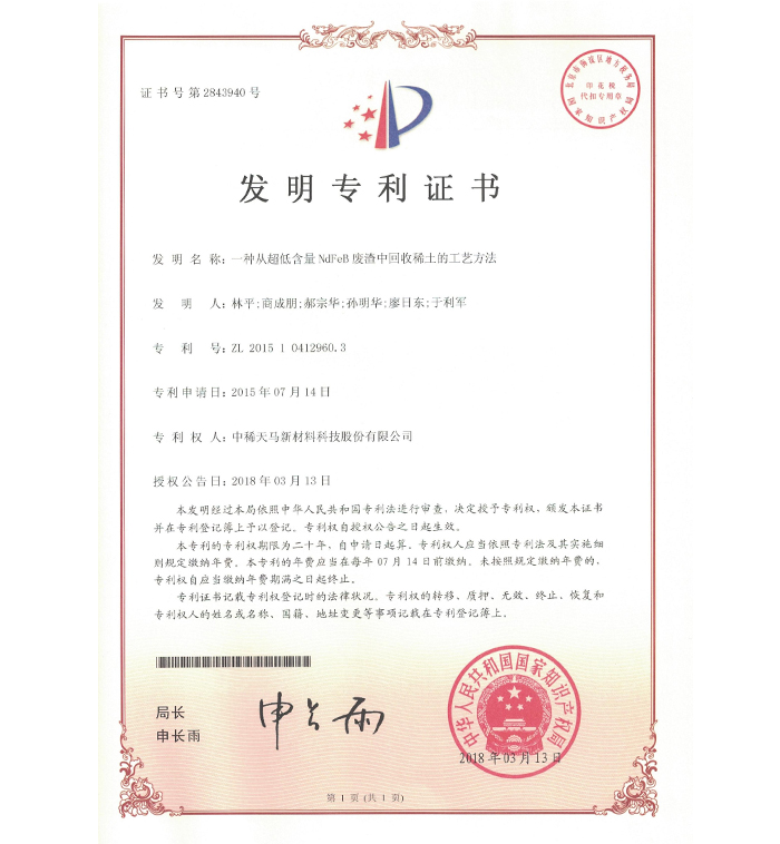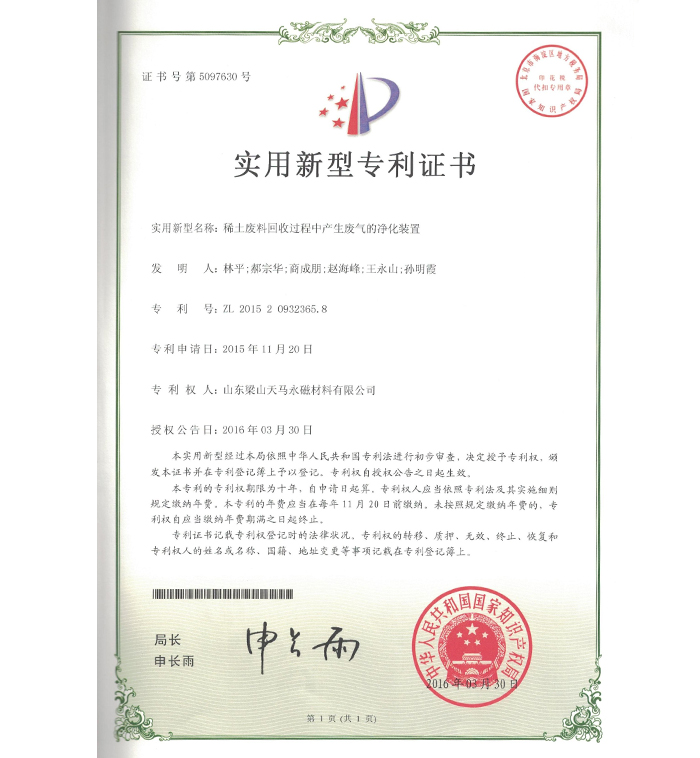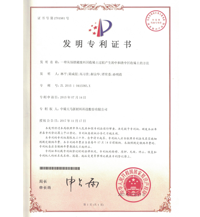 企業(yè)各項技術指標均居同行業(yè)領先地位,擁有 4 項國家發(fā)明專利,15 項實用新型專利及 11 件軟件著作權;是中國稀土行業(yè)協(xié)會理事單位、山東稀土行業(yè)協(xié)會理事單位,山東環(huán)境科學學會高級會員、中國稀土學會火法冶金專業(yè)委員會委員、中國綠色發(fā)展聯(lián)盟理事單位、中國再生資源回收利用協(xié)會理事單位,是全國稀土標準化技術委員會委員;通過了 ISO9001 質量管理體系認證、ISO14001環(huán)境 管理體系認證、OHS18001 職業(yè)健康安全管理體系認證、市政府節(jié)能辦清潔生產評估。